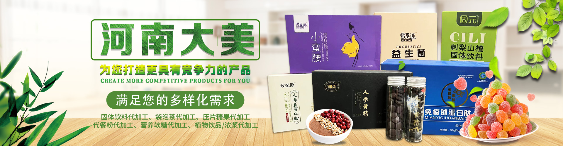 河南大美生物科技股份有限公司是從事顆粒劑、(固體飲料類),壓片糖果代加工等研發(fā)和銷售為一體的生產企業。公司依托自身的高科技研發(fā)隊伍和營銷團隊,為國內外客戶提供營養食品各劑型和規(guī)格的研制、生產、配方設計、批文申報等服務,并為客戶提供多種形式的流通渠道及產品銷售服務工作。 您的要求就是我們的使命!我們的宗旨是與客戶“合作共贏,攜手向前”,共同創造事業新的輝煌!